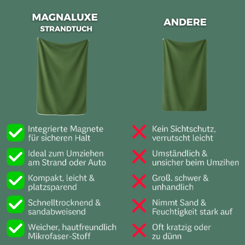 Warum MAGNALUXE? Herkömmliche Handtücher verrutschen, sind schwer und voll Sand. MAGNALUXE hält durch Magnete, ist leicht, kompakt, schnelltrocknend und superweich – perfekt zum Umziehen am Strand oder Auto. Einfach clever!